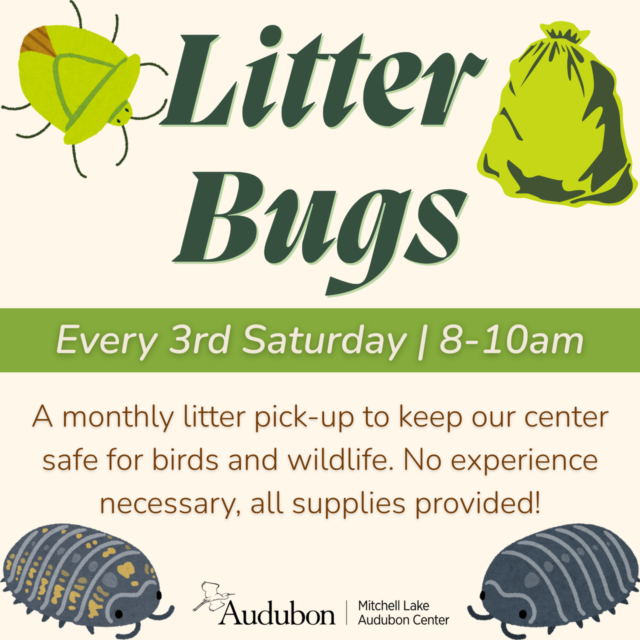 Help us take back the phrase “litter bug” by doing something good for birds and wildlife. Join us each third Saturday for a community litter pick-up to help keep Mitchell Lake Audubon Center safe and welcoming for the wildlife that call it home. No experience necessary and all supplies are provided. Participants must be at least 8 years of age, and those under 16 must be accompanied with an adult at all times.